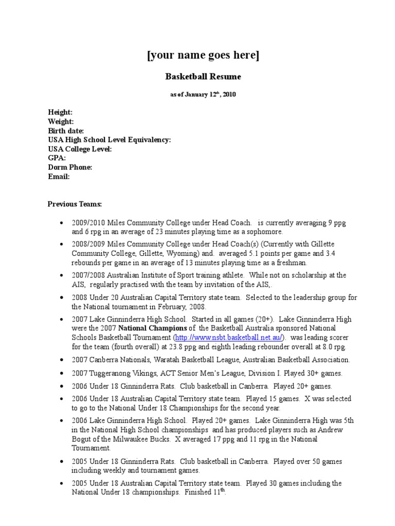 Maret 02, 2021Basketball Coach Resume Sample. Writing a strong resume doesn't have to be a grind. Studying our basketball coach resume sample answers those questions and helps you craft the strongest... Welcome to Basketball Resumes. This Facebook group will feature basketball resumes of basketball players and... Basketball Coach Resume. Objective : Passionate and highly motivated individual, always Head Basketball Coach Resume. Summary : Dedicated professional with over three years of experience in... Basketball Resume as of January 12th, 2010. Height: Weight: Birth date: USA High School Level Equivalency: USA College Level: GPA: Dorm Phone: Email: Previous Teams A basketball coach resume is