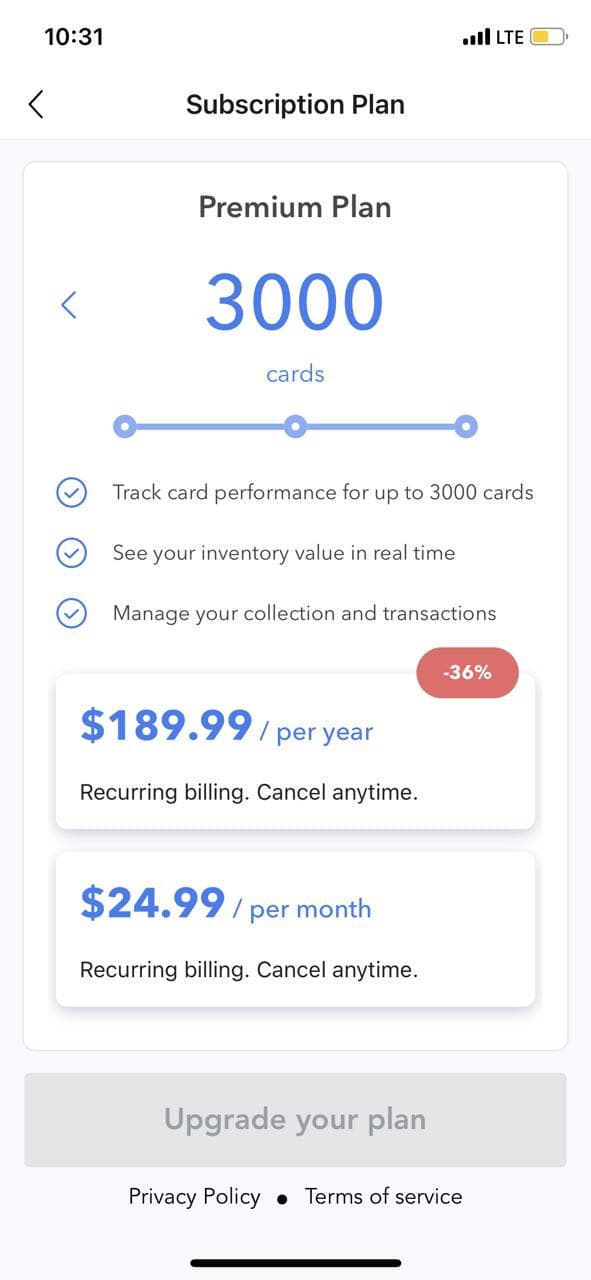 example of a mobile paywall screen: cardbase: sports cards tracker