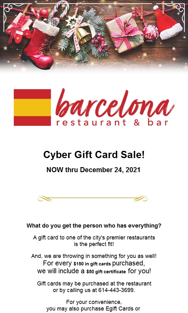 barcelona restaurant now through december 31st! for every $100 in gift cards purchased, you will all receive a $25 bonus gift certificate! visit our website to order or simply click the '